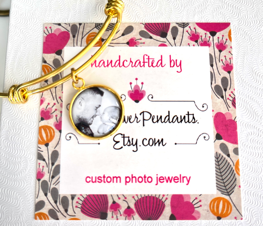 Gold Photo Charm Bangle Stack bracelet with picture charm