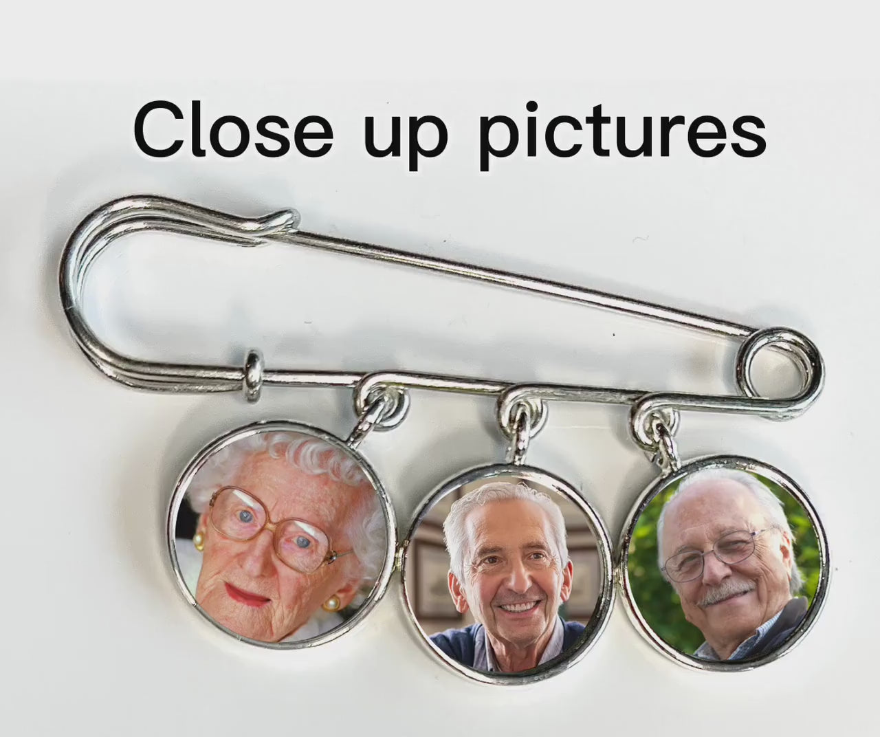 Our gift for groom from bride memorial photo Lapel Pin has 3 custom photos or 2 photos and 1 message on sterling silver plated charms that measure .75".