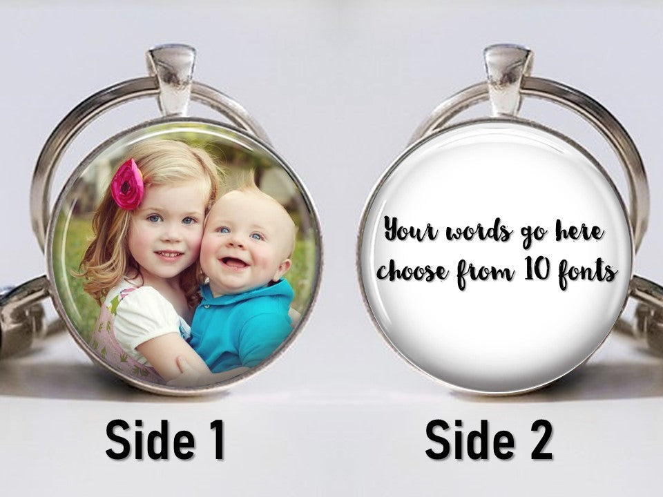 Our Double sided personalized keychain lets you put your own message or name on the back. Write your message and font choice in the personalization box.